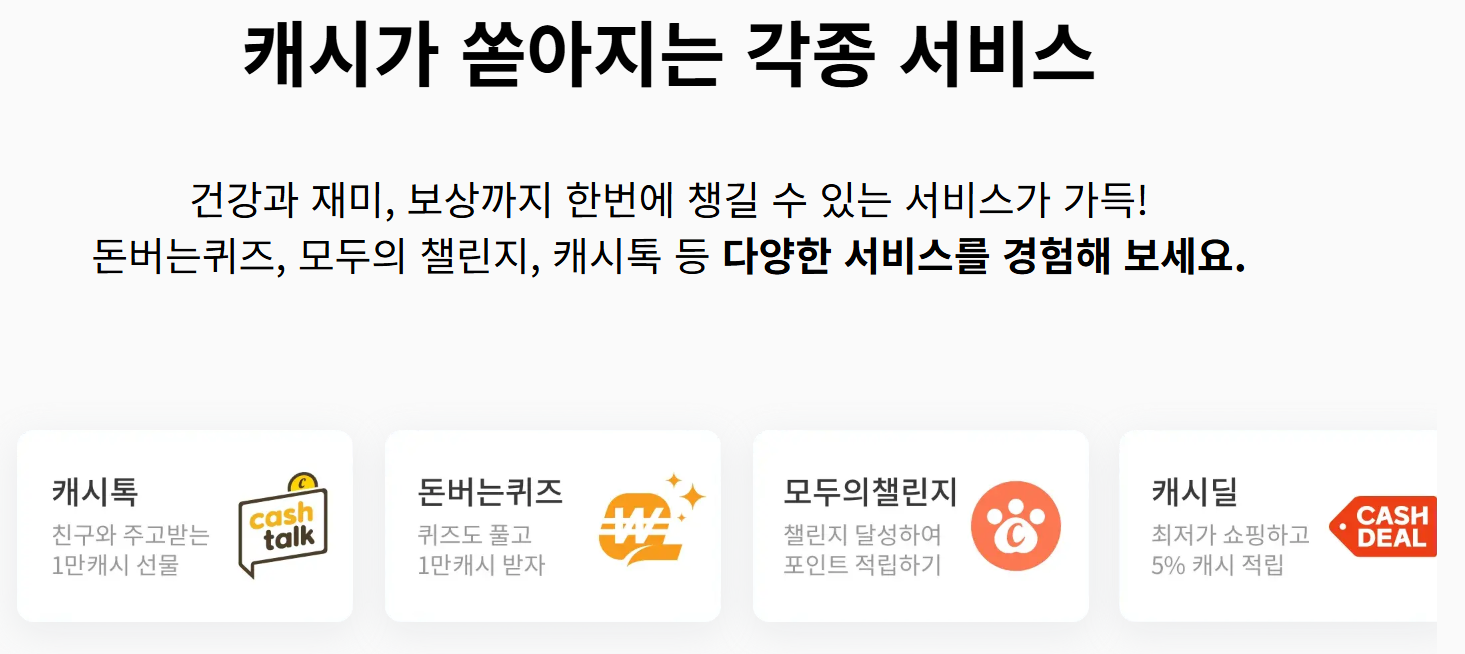 - 퀴즈 외에도 '캐시딜', '제로딜', '돈버는미션', '라방' 등 다양한 참여 콘텐츠를 통해 캐시 적립이 가능합니다.