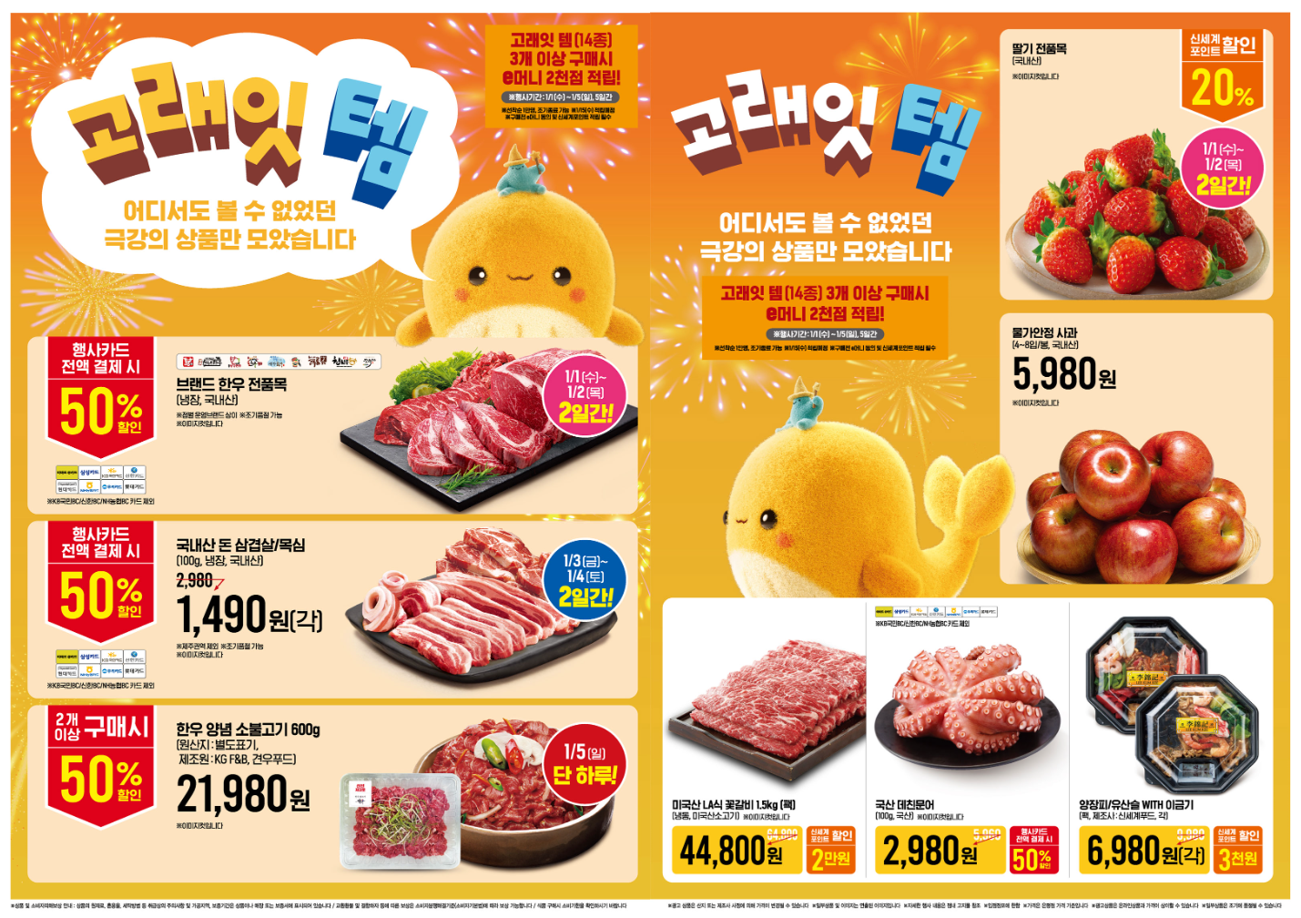 - 브랜드 한우: 50% 할인, 1/1~1/2 두 날만 진행