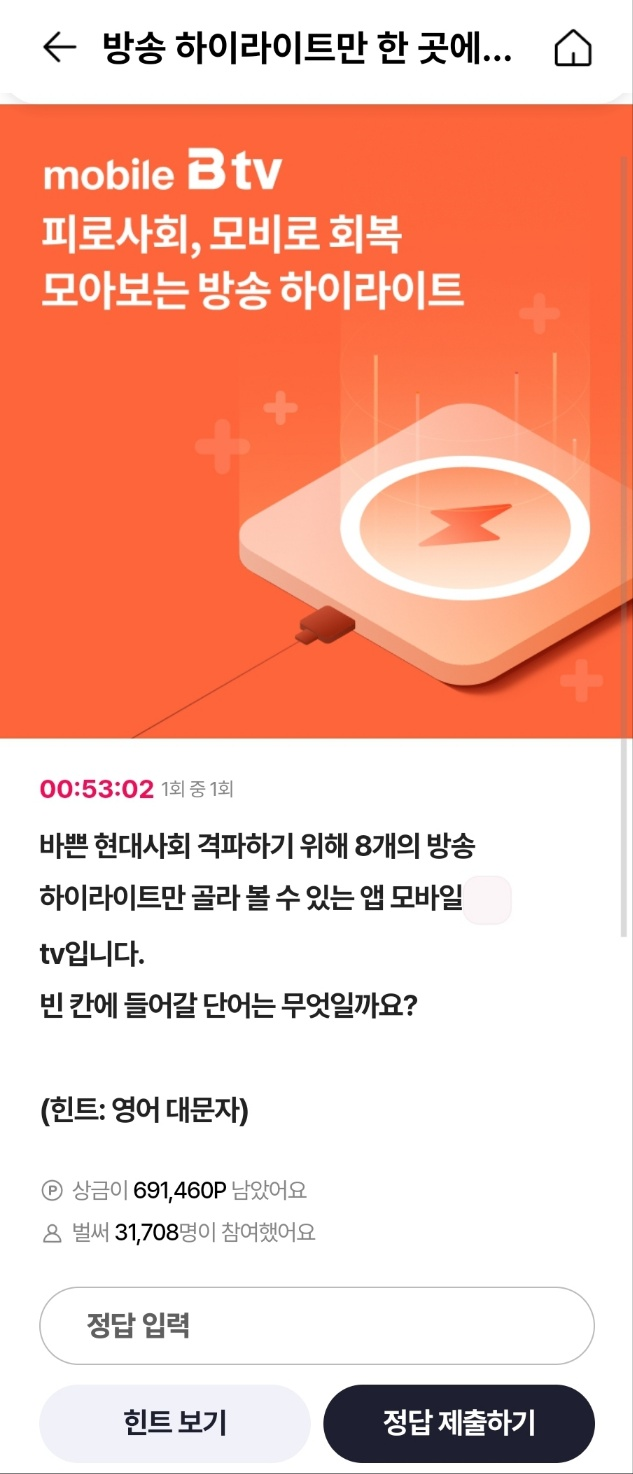 문제: 바쁜 현대인들을 위해 방송 하이라이트를 한 곳에서 시청할 수 있는 앱은 ‘모바일 ○tv’입니다. 빈칸에 들어갈 단어는 무엇일까요? (힌트: 영어 대문자)